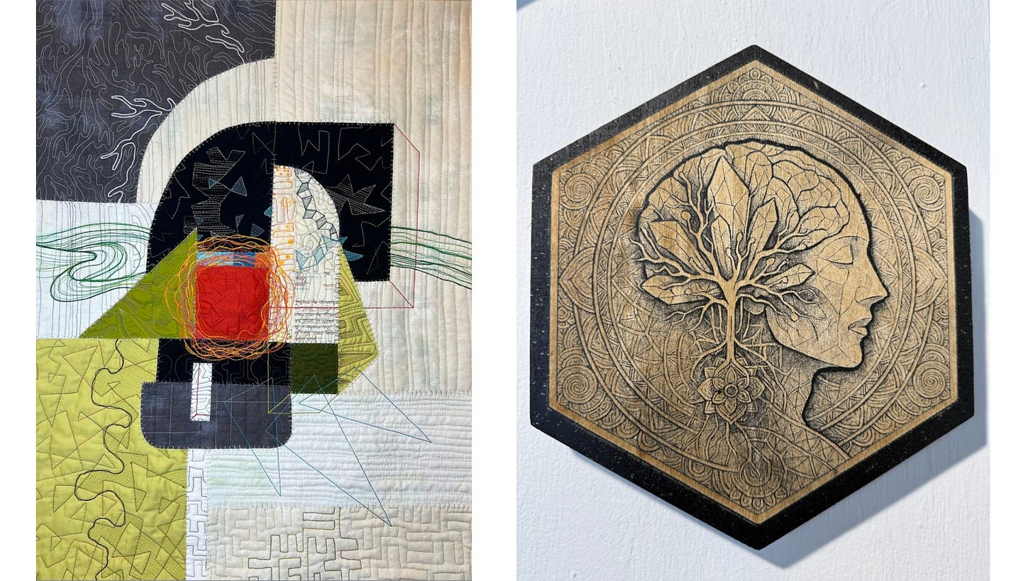 Where Lauri’s textiles are flexible and layered, Jeremy’s materials are fixed and elemental. Where her stitching creates pathways, his etched lines carve them. The work doesn’t compete; it converses.