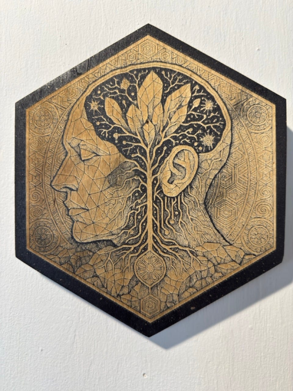 Jeremy followed up afterward, and we met for coffee at Le Bon Nosh. He’s warm, thoughtful, and deeply curious, qualities that often show up in the work before they show up in a biography. While he creates large-scale paintings and immersive projects, what stayed with me were his etched works in wood and slate. As I began thinking more concretely about the exhibit, the pairing clicked almost immediately.